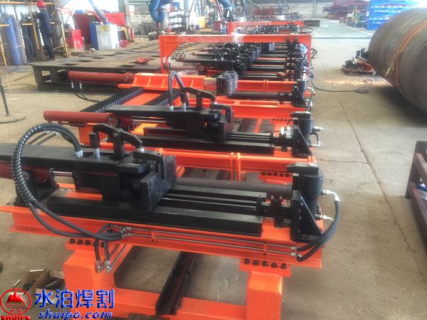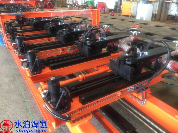 液壓縱梁點固工裝可同時加工兩件大梁,兩側互不干擾,適用于多種類型,鵝頸處可直接壓彎成型增加效率,翼板、腹板可隨意調節適用更多大梁,上下翼板采用旋轉油缸壓緊可防止翼板焊接時變形,腹板配有壓緊機構,工裝配有大梁升降輸送滾輪方便工件工位之間的輸送。