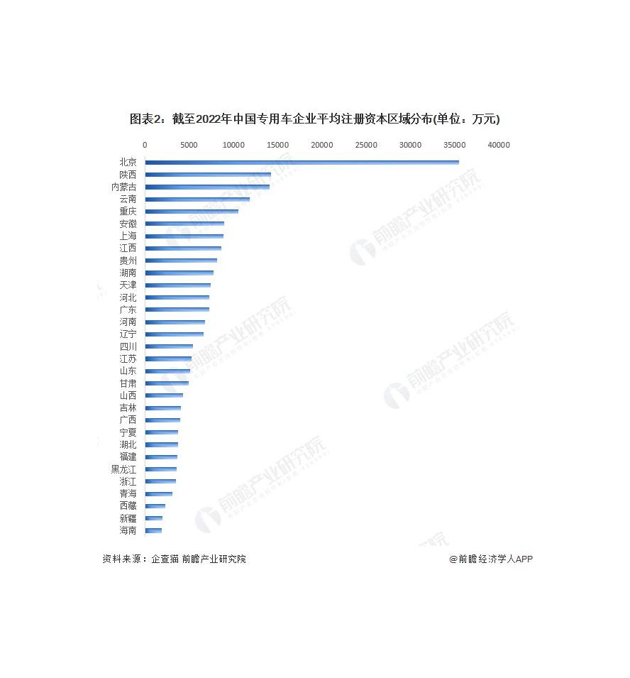 根據(jù)中國(guó)企業(yè)數(shù)據(jù)庫(kù)企查貓,目前中國(guó)專(zhuān)用車(chē)企業(yè)的平均注冊(cè)資本區(qū)域分布中,北京企業(yè)的平均注冊(cè)資本最高,達(dá)到 35468 萬(wàn)元。