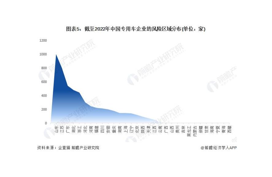 根據(jù)中國(guó)企業(yè)數(shù)據(jù)庫(kù)企查貓,目前中國(guó)專(zhuān)用車(chē)有相關(guān)風(fēng)險(xiǎn)信息的企業(yè)主要分布在山東省和江蘇省等地。截至目前,江蘇省共有 1001 家企業(yè)涉及風(fēng)險(xiǎn)相關(guān)信息,而江蘇則有 799 家企業(yè)涉及風(fēng)險(xiǎn)相關(guān)信息。